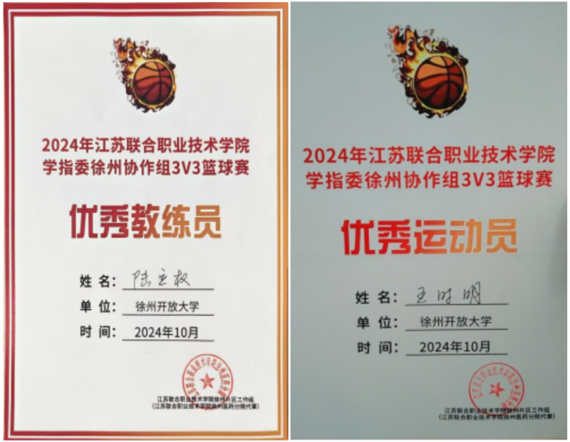 2024年10月 18日,我?;@球隊在江蘇聯(lián)合職業(yè)技術(shù)學院徐州片區(qū)舉辦的三人籃球比賽中,憑借出色的團隊協(xié)作、精湛的技術(shù)水平和頑強拼搏的精神,榮獲了二等獎的優(yōu)異成績,陸立權(quán)老師獲得優(yōu)秀教練員,我院21高職會計2班王時明同學獲得優(yōu)秀運動員的光榮稱號。此次獲獎不僅是對我?;@球隊隊員們辛勤訓練、不懈努力的肯定,也是對我校體育工作的一次鼓舞和鞭策。