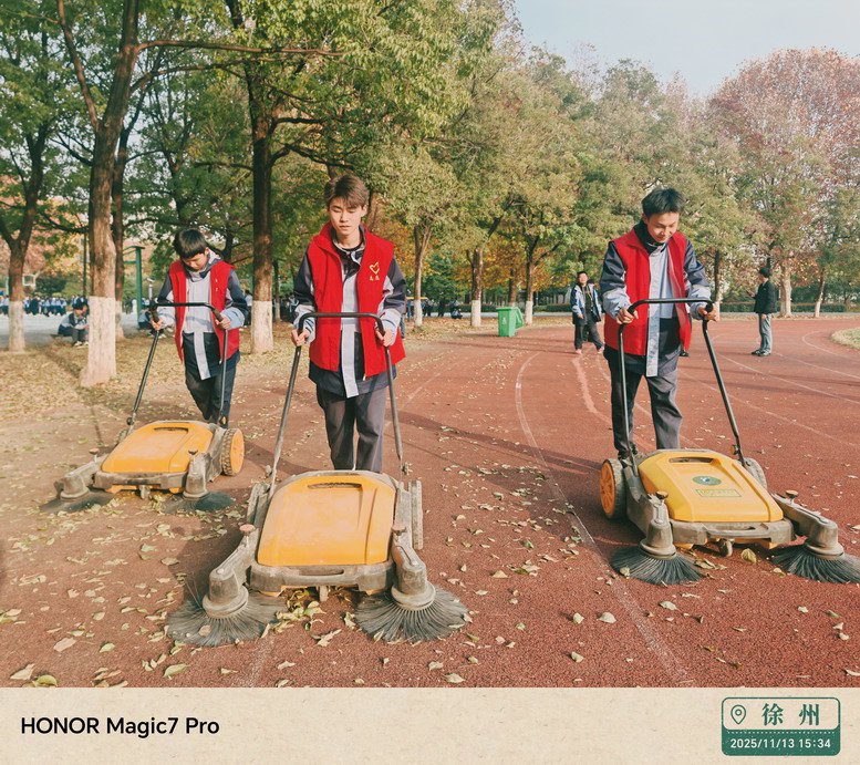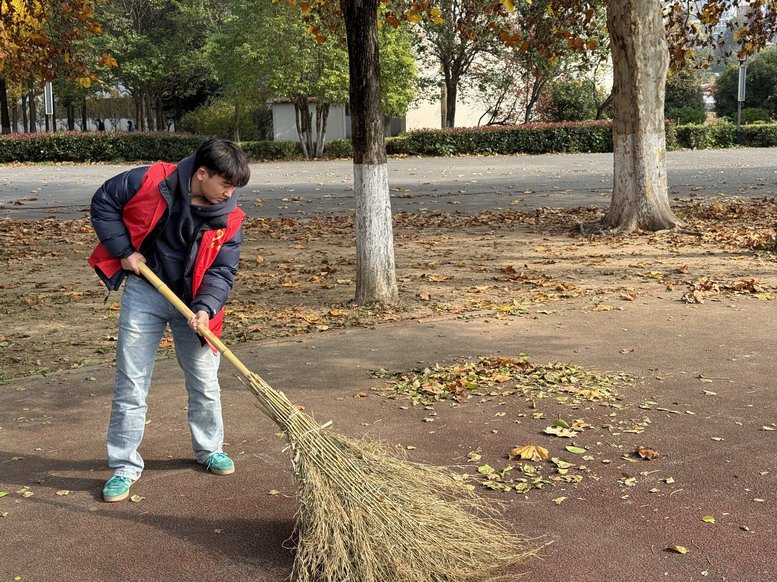 活動現(xiàn)場,志愿者們手持掃帚、簸箕、垃圾袋等工具,分工協(xié)作、默契配合。大家彎腰俯身,細致清理跑道旁的紙屑、飲料瓶等垃圾,認真清掃操場內(nèi)外大量枯黃落葉, 重點整治角落縫隙等衛(wèi)生盲區(qū)。凜冽寒風中,志愿者們干勁十足,忙碌的身影構(gòu)成了校園里一道靚麗的風景線。經(jīng)過近兩小時的集中清掃,操場路面潔凈如新,整體環(huán)境煥然一新。?
