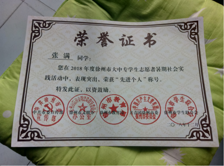 2019年4月25日,我院小水滴志愿者服務(wù)隊(duì)在2018年度徐州市大中專學(xué)生志愿者暑期社會(huì)實(shí)踐活動(dòng)中,表現(xiàn)突出,榮獲“優(yōu)秀團(tuán)隊(duì)”稱號(hào)。小水滴志愿者張滿同學(xué)榮獲“先進(jìn)個(gè)人”稱號(hào)。